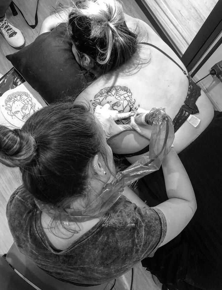 Bruna desenvolve tatuagens com traço livre, intuitivo e profundamente conectado a quem escolhe marcar a pele com significado.